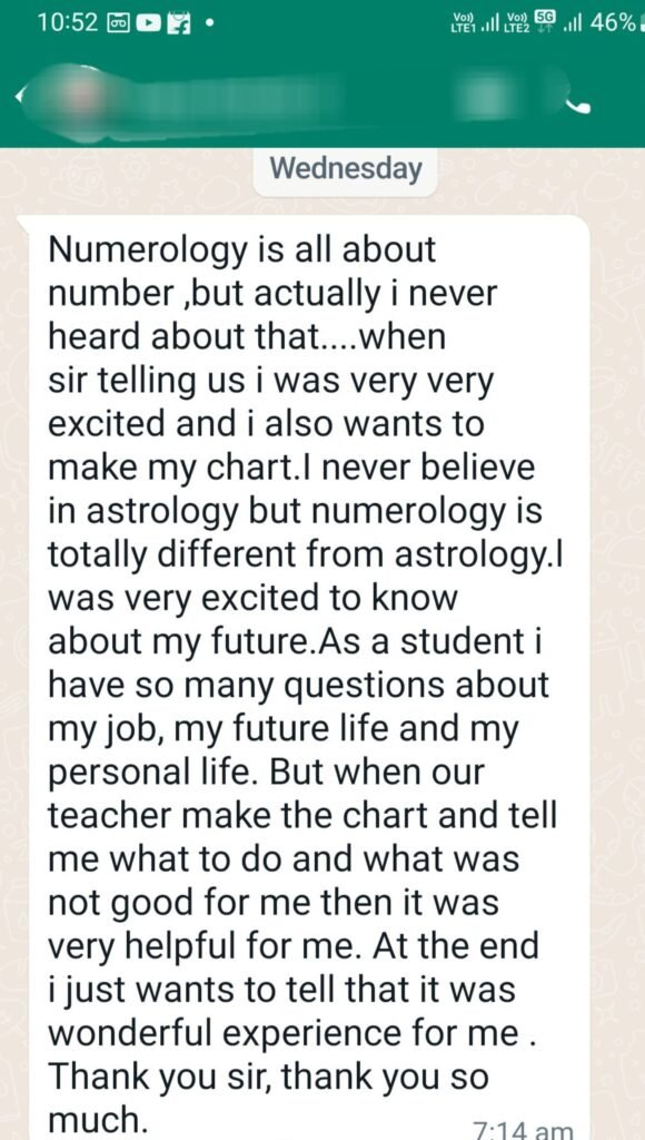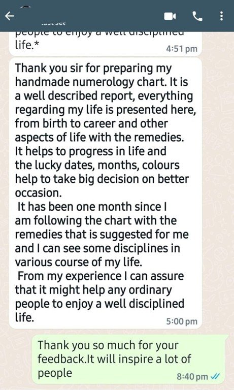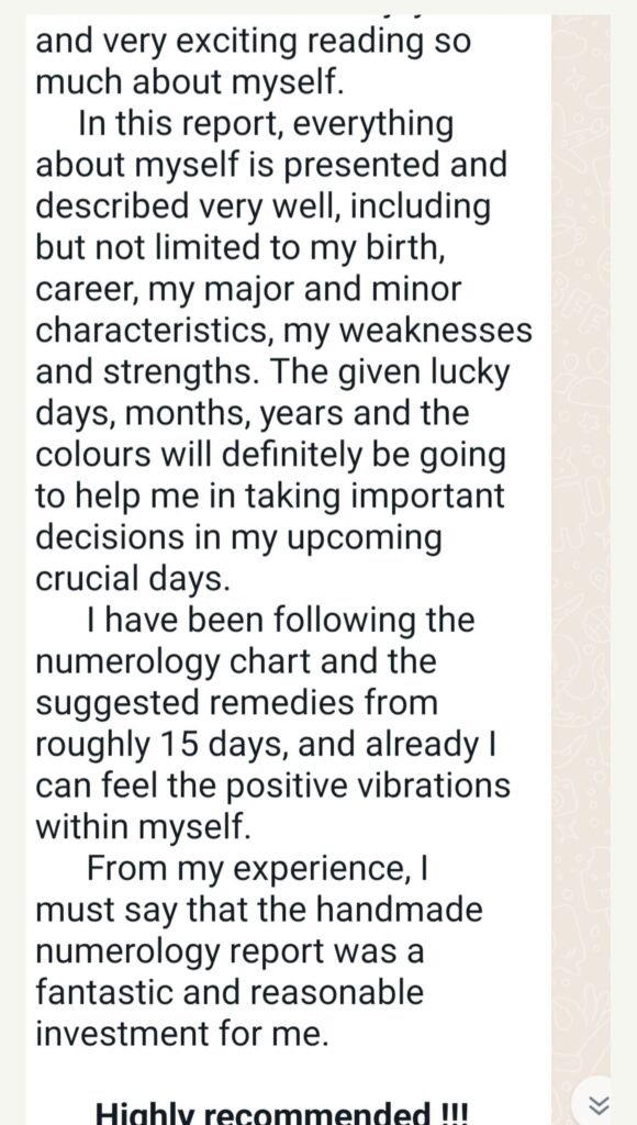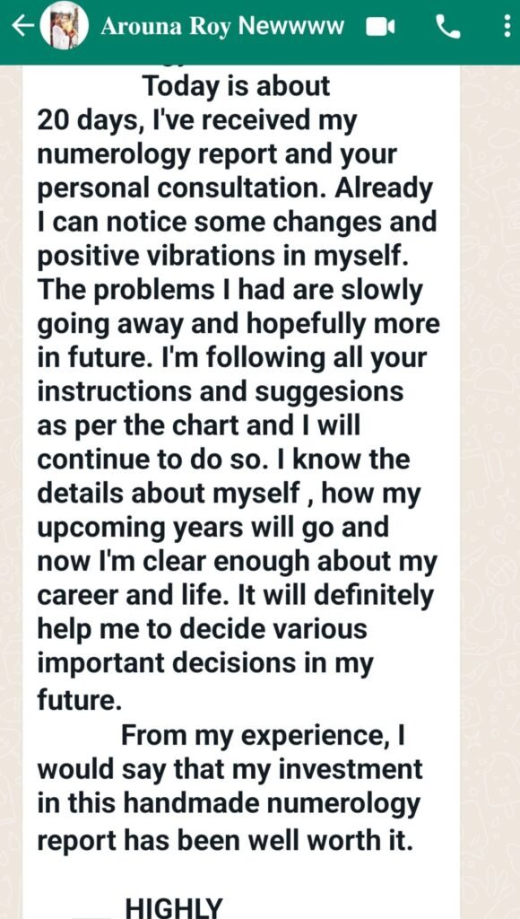 ONCE YOU SUBMIT ALL THE DETAILS,IT TAKES 3-5 DAYS TO COMPLETELY PREPARE THE REPORT.I SHALL INFORM YOU ONCE IT IS READY. THE REPORT WILL BE SHARED TO YOUR EMAIL ID. ALONG WITH IT A VIDEO OF DETAILED EXPLANATION ABOUT HOW TO READ THE REPORT WILL BE SHARED WITH YOUR WHATSAPP…. ONCE YOU WATCH THE ENTIRE VIDEO AND READ THE REPORT,YOU SHALL INFORM ME,I WILL GIVE YOU 45 MINUTES CALL CONSULTATION/OR ZOOM CONSULTATION AS PER YOUR PLAN TO MAKE YOU UNDERSTANT ABOUT THE REPORT, AND I SHALL ANSWER ALL THE QUESTIONS RELATED TO YOUR LIFE AND GUIDE YOU NUMEROLOGICALLY AND ASTROLOGICALLY .
